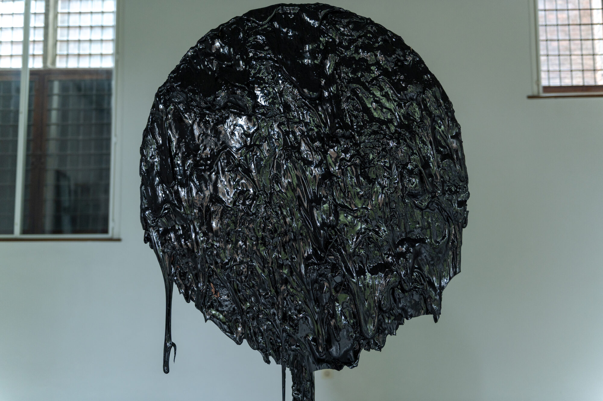 The work consists of five bitumen and tar sculptures emitting low-frequency audio signals. Each of the objects acts as an autonomous sonic agent, distorting, amplifying and resonating sonic frequencies sent through its body. The sound is composed using two tuning systems set against each other – a 31-steps EDO and equal temperament. It was then processed using auto-tune (a technology which was developed by repurposing petroleum extraction algorithms) with the sculptures forming one polyphonous body. The resulting pulsating low frequencies refer back to the origins of bitumen – a sacred material found in natural deposits which emit low rumbling noises as this black viscous mater rises from below. This sound, a murmur, was often interpreted in ancient writings as a rumbling echo of divining underworld demons.